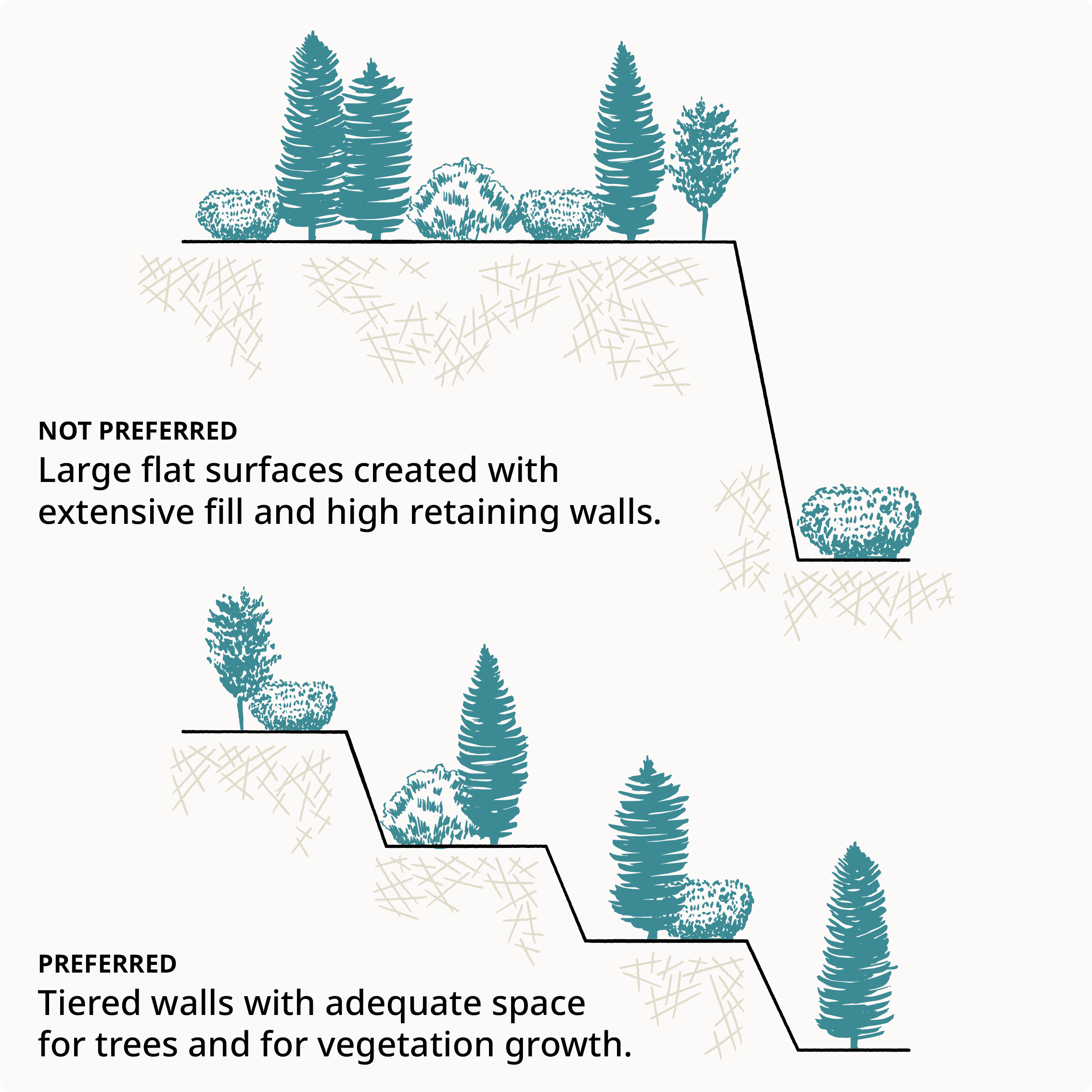 - Large-scale grading and the creation of expansive flat terraces on hillsides should be avoided.